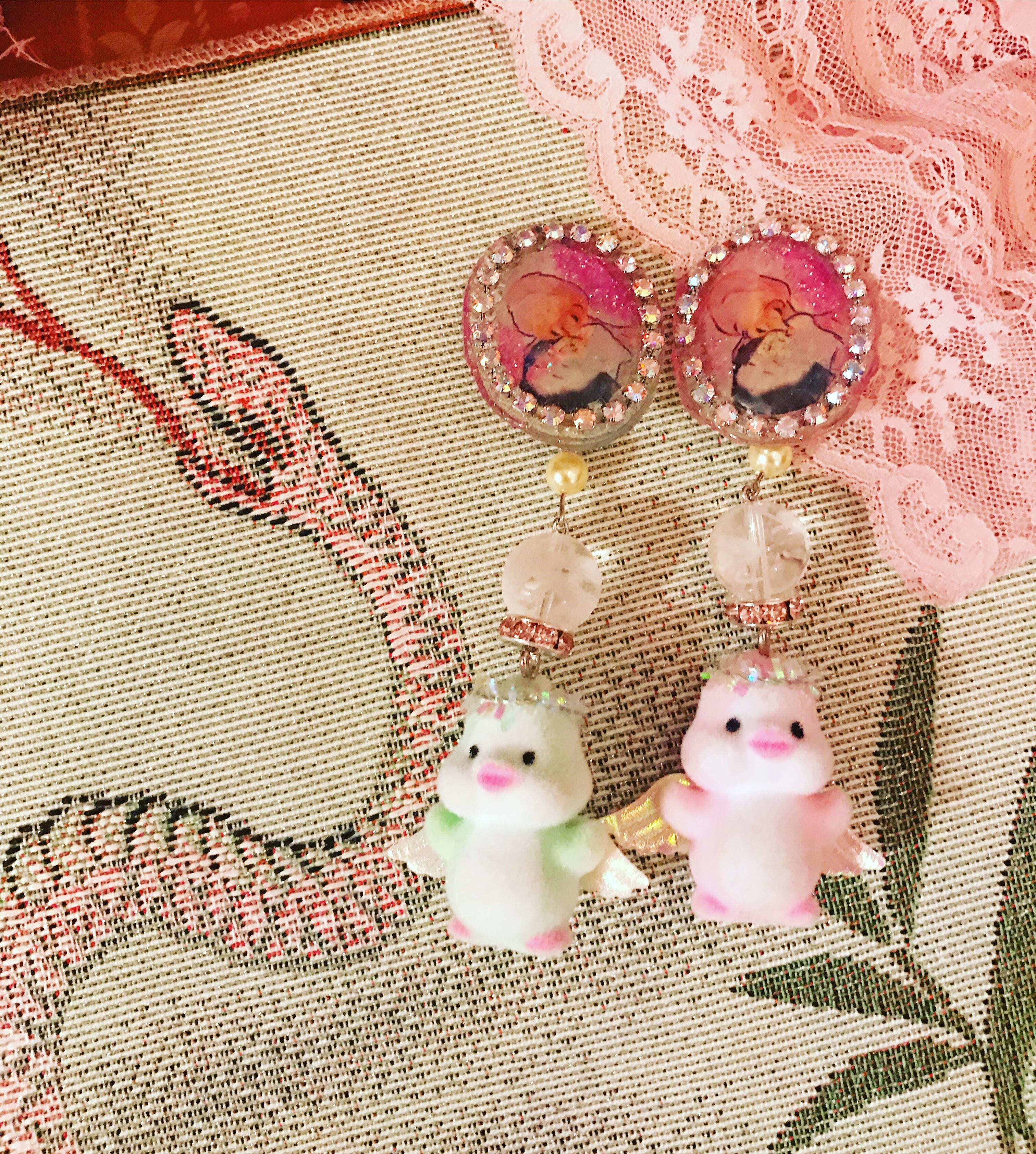 蛸と海女の春画モチーフに、鳳凰と龍の水晶、ピュアなペンギンのイヤリングです